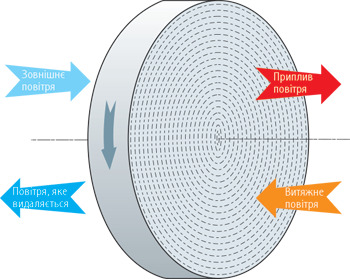 В установці застосовуються роторний рекуператор з алюмінієвої стрічки. Є коротким циліндром, який обертається. Внутрішня частина його заповнена алюмінієвою стрічкою, припливне і витяжне повітря проходять через нього. При обертанні регенератора відбувається нагрівання однієї частини теплим витяжним повітрям, інша ж частина віддає тепло припливному повітрю. Конденсат при цьому не утворюється, оскільки волога віддається припливному повітрю